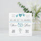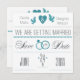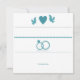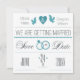 Un faire-part blanc cassé et turquoise avec des coeurs, des colombes, des anneaux mariages et un message "Sauvez la date".