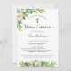 Elégante invitation à la première communion en espagnol, avec d'exquis détails floraux d'aquarelle et des éléments modernes de calligraphie manuscrite à l'avant et à l'arrière. Une invitation neutre pour les hommes, idéale pour la confirmation des filles et des garçons. Retournez avec un coin cadre moderne style logo avec la date et le nom de la première communion de votre enfant. Feuillage et fleurs verdoyantes dans un beau mélange de tons vert, blanc, jaune, gris et or. Style élégant, moderne et frais. Ce même design est également disponible en anglais.