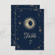 Soleil et lune d'or céleste, étoiles sur un arrière - plan bleu marine.