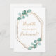 Demandez à votre servante d'accueil d'être dans votre mariage dans le style avec cette élégante invitation botanique "Serez-vous ma servante d'accueil ?". Ce design modèle chic présente un cadre géométrique en faux or accentué par des eucalyptus aquarelles peints à la main. Dans le centre en main lettré script moderne il a un nom à personnaliser avec la question "Serez-vous ma demoiselle d'honneur". Conçu par Susan Coffey.