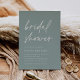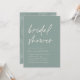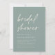 Invités Invitations pour célébrer la mariée d'être avec ces invitations modernes et minimes à la douche nuptiale. Le design simple comprend une "douche nuptiale" en décontracté écriture manuscrite sur un arrière - plan vert eucalyptus doux, avec les détails de votre événement aligné en bas à gauche en lettres blanches modernes. Un subtil motif tonal en feuille de palme sur le dos complète le design.