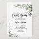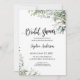 Invitation à la douche nuptiale d'eucalyptus vert. Ce magnifique design présente d'élégants feuilles d'eucalyptus contre un arrière - plan doux et neutre, ce qui en fait le choix idéal pour une douche de mariée à thème botanique. Design avec un bouquet de verdure aquarelle, eucalyptus. c'est la façon parfaite de partager la joie et l'excitation des noces à venir avec la famille et les amis. Commandez les vôtres dès aujourd'hui !