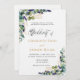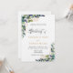 Un arrière - plan blanc décoré de verdure d'eucalyptus aquarellée, de fleurs de lavande et de feuillage doré. Personnalisez et ajoutez vos noms et les détails du mariage. Lettres noires et dorées.