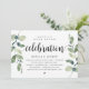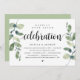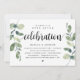 Carton d'invitation thématique Eucalyptus, Vert rustique moderne, écriture noire (avec titre sur la carte : Célébration de bonheur éternel). Il est parfait pour votre réception de mariage intime / fête de célébration après le mariage. Ajoutez vos détails avec une police / lettrage noir assorti.