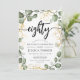 Elégante invitation botanique à la fête du 80e anniversaire. Le design classique présente une aquarelle peinte à la main, une couronne d'eucalyptus et une police de script. Personnalisez avec vos propres détails. Idéal pour une célébration anniversaire digne de quatre-vingts ans.