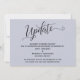 La distinction de cette suite est due à la police de caractères cursive élaborée utilisée pour les phrases d'accent. Dans le cas où vous auriez besoin d'informer vos invités que votre mariage a été annulé, cette carte offre une option élégante. Dans ce modèle, la police de calligraphie a été utilisée pour créer un graphique représentant le mot " Mise à jour ". Utilisez les champs du modèle pour ajouter vos informations personnelles et faire de ce design le vôtre. L'arrière-plan peut être changé en n'importe quelle couleur de votre choix. N'hésitez pas à nous contacter pour toute demande spéciale ou pour une aide à la personnalisation. // 98 //