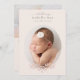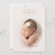 Cette annonce de naissance simple et élégante comporte une seule photo ovale sur le devant avec des détails de typographie classique pour le nom et les statistiques du bébé, y compris la date de naissance, le poids et la taille. Détail floral pastel doux en corail rose blush et points bleu pérywinkle doux. Le verso comprend un espace pour un message de famille personnalisé facultatif et une deuxième photo rectangulaire grande.