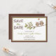 Cartes d'invitation de déclaration de date de mariage fantaisistes avec deux hiboux mignons assis sur une branche avec un cœur dans une bulle de dialogue au-dessus d'eux. Bordure marron et verte sur fond blanc. Personnalisé avec vos informations dans l'espace prévu. Procurez-vous les tampons de déclaration de date de mariage Hibou ci-dessous :