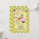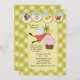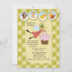 Une fée géante, un cupcake et des images de jouets sont présentés pour créer cette invitation à l'anniversaire qui a un arrière - plan plaid jaune et vert. Cuisine et sucré à souhait.La carte est facile à customiser avec votre libellé, police, couleur de police et choix de six types de papier.