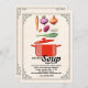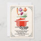Une invitation colorée comportant une série de légumes et un pot rouge de soupe. Idéal pour un dîner de réunion de soupe ou une partie d'échange de soupe.