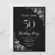 Une invitation à la fête du 50e anniversaire en noir et blanc avec des coins diagonaux en dentelle ornée pour encadrer le texte blanc.