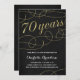 Cette invitation chic et élégante à la fête du 70e anniversaire présente d'élégantes fioritures vintages, une calligraphie de script qui dit "70 ans", une fausse feuille d'or, et un arrière - plan noir chic.