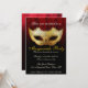 Invitation Fantaisie pour Soirée de Mascarade. Une invitation élégante et sophistiquée présentant un masque de mascarade doré avec des fioritures noires, un fond de couleur canneberge avec un motif damassé subtil sur fond noir et une typographie élégante personnalisable pour les détails de votre soirée.