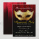 Invitation Fantaisie pour une Soirée de Mascarade. Une invitation élégante et sophistiquée présentant un masque de mascarade tonifié or avec des fioritures noires, un fond tonifié canneberge avec un motif damassé subtil superposé en noir et en caractères fantaisie personnalisables pour les détails de votre soirée.