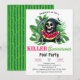 Carton d'invitation pour une fête au bord de la piscine pour Summerween avec la Faucheuse - Célébrez l'été avec la Faucheuse ! Cette invitation présente une Faucheuse drôle avec la classique cape noire et la faux en train de manger une pastèque sur un fond de verdure tropicale luxuriante. Parfait pour une fête Summerween meurtrière ! Conçu pour les amateurs d'Halloween et les passionnés de films d'horreur. Avec une police vintage, grunge et en détresse, personnalisez ce modèle de carton d'invitation de fête d'été modifiable avec vos propres détails d'événement. Au dos, vous trouverez un motif d'écorce de pastèque en vert foncé et clair. Disponible à la commande sous forme de cartons d'invitation imprimés ou de téléchargement numérique instantané que vous pouvez envoyer par e-mail, SMS ou sur les réseaux sociaux.