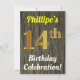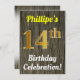 Ce design d’invitation à la fête d’anniversaire comporte un message comme "Fête du 14e anniversaire de Phillipe!", où le nom peut être personnalisé, et où le numéro "14e" a un faux aspect doré. Il dispose également d'un arrière - plan rustique de style imitation bois. Les détails de l'événement sur le dos peuvent être personnalisés. Il pourrait être utilisé pour invitation des gens à la fête du quatorzième anniversaire ou à la fête d’anniversaire de quelqu’un. [~Z0000119]