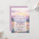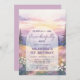 Boho and rustic Christian girl's first birthday design based on psalm 139 "Fearfully and Wonderfully Made" with a watercolor-style landscape with mountains, fir trees, wildflower meadow, and a rising sun in soft pastel colors of pink and purple.