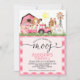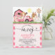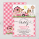Invitation d'anniversaire à thème de ferme douce comportant une scène de ferme et un motif carreaux rose. Le design comporte également une image de police de calligraphie amovible. Cette conception est un moyen doux d'inviter les invités à une fête d'anniversaire à thème de ferme de fille.