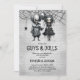Êtes-vous prêts à inviter vos amis et votre famille à la fête d'Halloween la plus effrayante de l'année ? Venez rejoindre le côté loufoque et effrayant de la saison des fêtes avec une célébration conjointe qui va faire hurler de joie tout le monde. Ces invitations de fête conjointe d'Halloween présentent un décor écrit à l'ancienne, une toile d'araignée, un clown effrayant, une fille gothique et un modèle de texte effrayant facile à personnaliser.