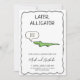 Une invitation de fête d'adieu amusante avec un alligator souriant. La carte est facile à personnaliser avec votre libellé, police, couleur de police, options de forme de papier et choix de types de papier. Pas exactement ce que vous cherchez ? Tous nos produits peuvent être conçus sur mesure pour répondre à vos besoins sans frais supplémentaires. Il suffit de nous contacter