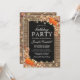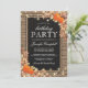 Cartes d'invitation de fête d'anniversaire de récolte rustique avec un fond en bois chic de campagne, centre de tableau noir, corde, citrouilles d'Halloween, feuillage d'automne, glands, une dispersion de feuilles d'automne, guirlande de lumières scintillantes et un modèle de texte d'invitation de fête personnalisé.