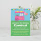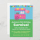 Des enfants seront excités pour recevoir cette invitation lumineuse et gaie de fête d'anniversaire qui a les festins délicieux prêts à servir d'un chariot de sucrerie de coton pour des enfants. Elle comporte un chariot rose de sucrerie de coton avec des ballons et des étoiles comme décorations. Un bon nombre de drapeaux colorés d'étamine traînent. C'est également parfait pour les écoles qui tiennent un carnaval d'école. Personnalisez facilement avec vos détails de partie.