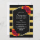 Invitation à la fête d'anniversaire rayée noir et or avec élégants étalages de fleurs rouges et oranges. Le texte est entièrement personnalisable pour vous permettre d'inclure toutes vos propres informations pour la célébration de votre anniversaire. (NB : Faux parties scintillant a été présenté sur cette invitation.)