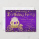 Invitation de fête d'anniversaire de princesse or et violet avec un élégant carrosse royal de princesse or et violet sur un beau fond de confettis or et violet. Vous pouvez facilement personnaliser cette belle invitation de fête d'anniversaire pour filles or et violet pour votre événement en ajoutant simplement vos détails dans le style de police que vous préférez. Il s'agit d'une conception imprimée sans vrais diamants, feuille d'or, paillettes, etc.