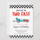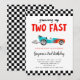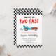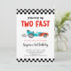 Carte d'invitation de fête d'anniversaire de 2 ans de thème de voiture de course mignonne avec illustration d'une voiture vintage bleue avec des flammes. Le texte dit "grandir trop vite".
