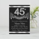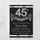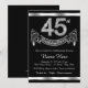 Invitation à une fête d'anniversaire des 45 ans avec des chiffres en diamant et une banderole sur fond argent et noir. Cette belle invitation de fête d'anniversaire des 45 ans en argent et noir est facilement personnalisable pour votre événement. Ce design saisissant convient aussi bien à un homme qu'à une femme. Vous pouvez changer la couleur de fond. Il s'agit d'un design imprimé sans vrais diamants, argent, paillettes, etc.