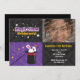 Cette invitation de partie de spectacle de magie comporte un lapin blanc jetant un coup d'oeil hors du casquette supérieur d'un magicien, d'une baguette magique magique, d'un endroit pour la photo de votre enfant et du texte personnalisable pour votre information de partie.