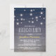 Cartes d'invitation d'anniversaire pour homme avec un fond ombré bleu bois rustique, des guirlandes lumineuses de pont de port et une formulation moderne.