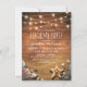 Cartes d'invitation d'anniversaire sur le thème de la plage pour adultes avec un fond de grange en bois rustique, des guirlandes lumineuses scintillantes, une plage de sable avec une étoile de mer et des coquillages. La formulation du modèle, le style et la couleur de la police peuvent être facilement personnalisés pour répondre à vos besoins.
