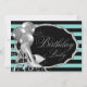 Des femmes ont inspiré l'invitation de fête d'anniversaire noir et bleu turquoise avec d'élégantes chaussures de talon haute parties scintillant argent et des ballons d'argent sur un beau arrière - plan turquoise bleu et noir rayé. Cette élégante invitation à la fête d'anniversaire en bleu turquoise et noir est facilement customisée pour votre événement en ajoutant simplement vos détails dans le style de police de votre choix. Il s'agit d'un dessin imprimé sans réelle parties scintillant, etc.