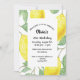 Des citrons juteux, délicieux et aquarellés en jaune, vert et blanc en toile de fond pour une fête de 21ème anniversaire. Un cadre blanc et vert avec des modèles pour un nom, l'âge et les détails de la fête. Le nom est écrit dans un script de style écrit à la main, en lettres noires.