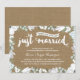 Cette invitation d'anniversaire de mariage de 25 ans élégante et décontractée présente une belle calligraphie, de belles fleurs bleues et blanches, une conception de typographie qui lit "Juste mariés (il y a vingt-cinq ans !)", et un fond en papier kraft imprimé. L'invitation d'anniversaire florale rustique est parfaite pour une célébration décontractée de jardin de cour arrière.