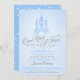 Cartes d'invitation pour une fête de bébé "Il était une fois" avec un château de conte de fées pour un garçon en bleu et gris, avec de belles fioritures typographiques. Le texte manuscrit dit "Il était une fois" en gris, avec un motif d'étoile magique au dos.