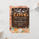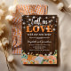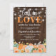 Invitation de fête de chauffage de maison de campagne d'automne avec un fond en bois rustique, des lumières de jardin en forme de guirlande, des fleurs aquarelles élégantes d'automne orange et blanches, la phrase mignonne "tombez amoureux de notre nouvelle maison", et un modèle de fête de nouvelle maison facile à personnaliser.