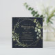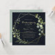 Cette invitation de fête de chauffage géométrique or bleu vert est parfaite pour une simple célébration de nouvelle maison. Le design présente de belles feuilles vertes peintes à la main sur un fond bleu foncé, ornant un cadre géométrique or.