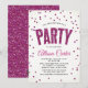 Une invitation de fête amusante avec une image de confettis scintillants et le mot "Fête" rempli d'une image de paillettes rose vif et de points de confettis en paillettes rose vif. Veuillez noter que ce design ne comporte pas de véritables paillettes ; c'est une image de paillettes. Il s'agit d'un design imprimé plat. Il n'y a pas d'embellissements. Copyright ©2014 The Spotted Olive™. Tous droits réservés.
