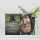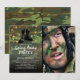 Invitation à une fête militaire patriotique pour célébrer le départ d'un soldat pour le service national, ou pour célébrer son retour à la maison. Avec un motif camouflage traditionnel noir, vert et marron, une photo du soldat, des bottes de combat, des guirlandes lumineuses et un modèle de fête moderne.
