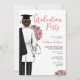 Invitation de la fête de fin d'études Médicales. Le médecin ou l'infirmière grand parti Invitation pour votre fille, nièce, mère, tante, cousin, ou ami. Invitation pour les grandes fêtes célébrant les femmes qui viennent d'obtenir leur diplôme de l'école de médecine, de l'école de sciences infirmières ou d'autres diplômes de médecine. Portant le portrait d'une femme avec des cheveux bruns dans un petit chignon, portant un manteau de laboratoire avec une robe noire de graduation drapée sur une épaule, et un bouquet de jolies fleurs roses dans son autre main, avec un stéthoscope de médecin couché autour de son bras. Acents de typographie de script rose.