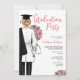 Invitation de la fête de fin d'études Médicales. Le médecin ou l'infirmière grand parti Invitation pour votre fille, nièce, mère, tante, cousin, ou ami. Invitation pour les grandes fêtes célébrant les femmes qui viennent d'obtenir leur diplôme de l'école de médecine, de l'école de sciences infirmières ou d'autres diplômes de médecine. Portant le portrait d'une femme aux cheveux droits dans un petit chignon, portant un manteau de laboratoire avec une robe noire de graduation drapée sur une épaule, et un bouquet de jolies fleurs roses dans son autre main, avec un stéthoscope de médecin couché autour de son bras. Acents de typographie de script rose.