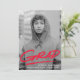 Invitations modernes et branchés de la fête de remise des diplômes avec la photo verticale de l'étudiant avec "Grad" en lettres rouges avec un trait de soulignement ci-dessous. Personnalisez le devant des invitations à la fête de remise de diplômes en ajoutant le nom du diplômé, le nom de l'école et l'année de remise de diplômes. L'invitation inverse pour afficher les détails de votre fête de remise de diplômes avec un arrière - plan de coups de pinceau rouges et blancs.