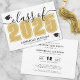 Cette faire-part de graduation horizontale classique mais moderne sert d'invitation à la fête. L'avant est décoré d'une "Classe 2025" surdimensionnée en noir et blanc, avec l'année en or jaune riche, complétée par d'élégants accents de script gris. Deux icônes de casquette de fin d'études ajoutent une touche festive, avec un espace en dessous pour le nom du diplômé et l'école. Les couleurs peuvent être customisées pour correspondre aux couleurs de l'école pour un look personnalisé. Le dos se transforme en invitation à la fête, avec une disposition élégante avec espace pour les détails de l'événement comme la date, l'heure, l'emplacement et les informations RSVP. Un mélange de typographie propre et d'écriture élégante crée une atmosphère sophistiquée et festive, parfaite pour célébrer cette étape importante avec la famille et les amis. Entièrement personnalisable pour convenir à votre style !