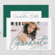 Invités Invitations pour célébrer la remise des diplômes avec nos invitations modernes de la fête de remise des diplômes photo. Les invitations branchés de la fête de remise de diplômes présentent la photo du diplômé avec "Graduate" dans une superposition de script de calligraphie moderne verte. Personnalisez le devant des invitations en ajoutant le nom du diplômé, le nom de l'école et l'année de fin d'études. L'invitation s'inverse pour afficher les détails de votre fête de remise de diplômes et un motif géométrique en pointillés vert et blanc tendance.