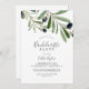 Cette invitation moderne à la bachelorette de branche d'olivier est parfaite pour une soirée boho dames. Le design rustique et élégant présente des feuilles botaniques et des olives noires d'aquarelle simple sur une petite branche à l'atmosphère méditerranéenne classique.