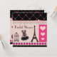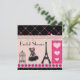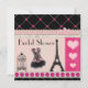 Invitations de Fête de la mariée. Invitations roses et noires de thème parisien de Tour Eiffel français vintage élégant, girly et fascinant de Fête de la mariée de collage avec Tour Eiffel noir, corset rose et noir à la mode, cage à oiseaux antique mignonne et coeurs roses romantiques décrits par parties scintillantes imprimés chics sur un bel arrière - plan de rose et rayures bronzages, notes musicales, pétales assez roses de fleur et un motif diagonal de pois rose à la frontière noire. Invitations contemporains modernes à la mode avec un regard vintage. Le double a dégrossi impression. Tout les texte est entièrement personalizable pour répondre à vos besoins et vous pouvez changer le style de police, la couleur et la taille de la police si vous désirez. Si vous avez besoin de n'importe quelle aide customisant votre produit svp me contactez par mon magasin et je serai heureux d'aider. NOTEZ SVP : Tous les invitations sur Zazzle ont des images imprimées d'appartement.