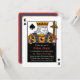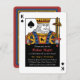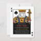 Cette invitation fantaisiste et amusante donne le ton décontracté à la soirée poker ! Le invitation est conçu comme un roi de carte de pique où le roi de la pique se tient une bouteille de bière et une épée qui perce à travers une tranche de pizza. Hé, même un roi a besoin de se détendre et de se détendre ! Passez une soirée amusante avec des jeux de cartes de poker, de la nourriture et des boissons! La page inverse utilise des éléments similaires de l'avant disposés pour ressembler à l'arrière d'une carte de jeu. Personnalisez avec les détails de votre fête dans l'espace noir fourni.