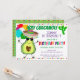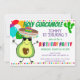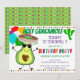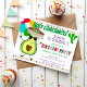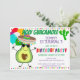 L'invitation à la fête d'anniversaire à thème de la fête de la Saint-Guacamole comporte un mignon avocat de dessin animé portant un sombrero tenant des ballons, des pois peints à la main et un cactus.